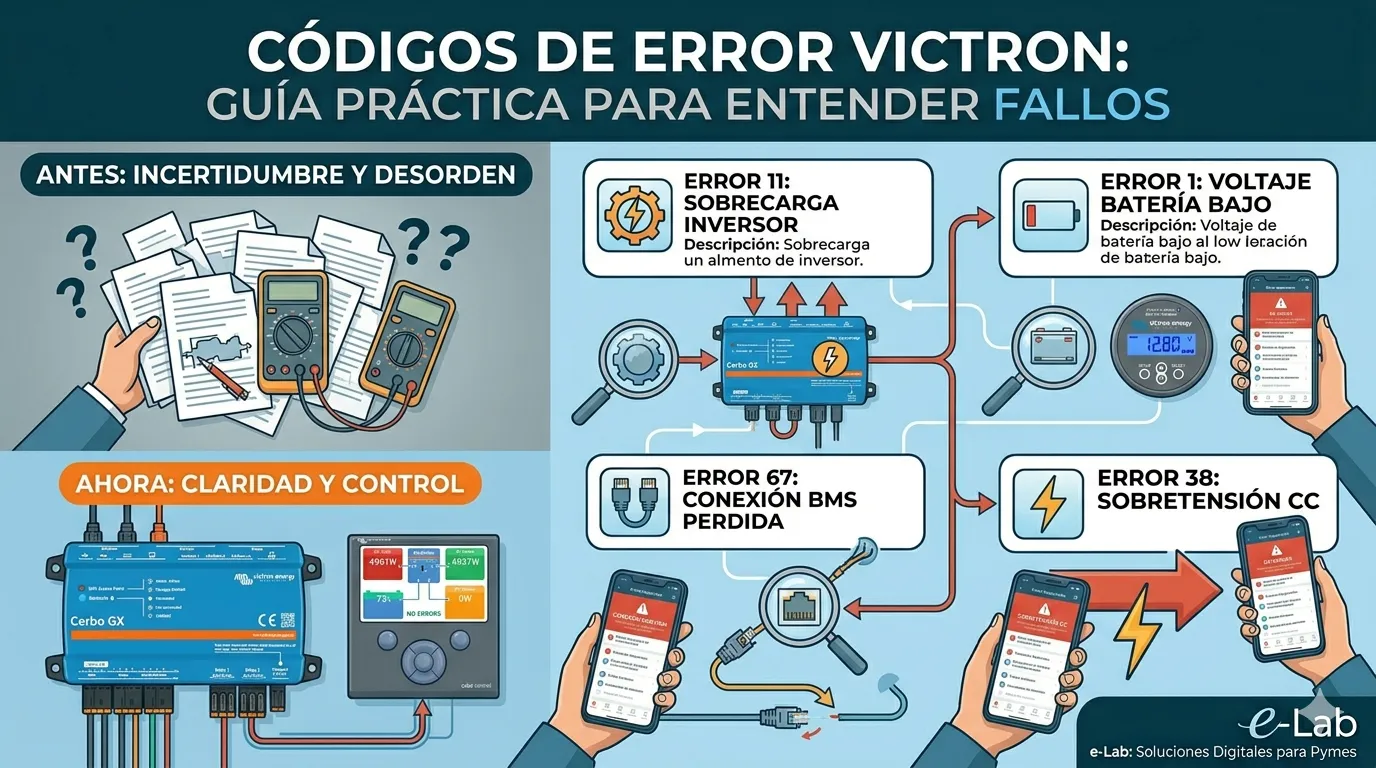Los equipos Victron pueden mostrar distintos códigos de error según el modelo, la combinación instalada y el tipo de sistema. En instalaciones con MultiPlus, Quattro o VE.Bus, la clave está en interpretar bien el código y revisar si el fallo afecta a una sola unidad o al sistema completo.